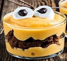 • 6. Sur une couche de crème au potimaron (irrégulièrment pour ressembler à des dents) cassez en morceaux deux cookies et recouvrez de crème.